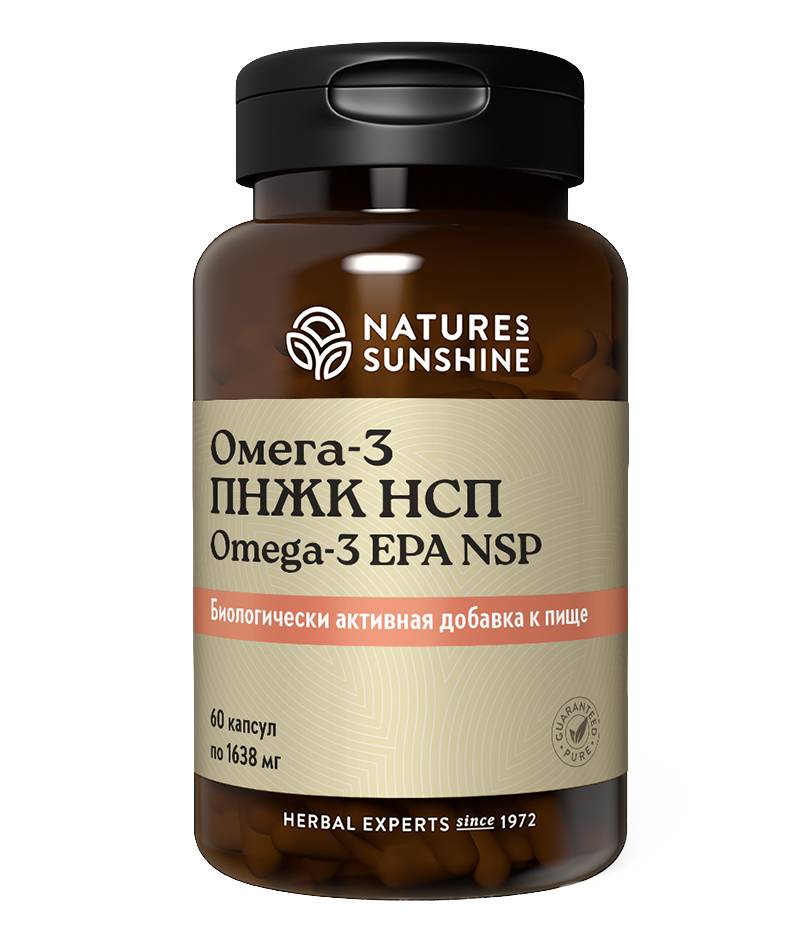 Омега-3 ПНЖК – семейство полиненасыщенных жирных кислот (ПНЖК), которые не образуются в организме человека, являются незаменимыми и должны поступать с животной и растительной пищей. Высшие жирные кислоты этого семейства: эйкозапентаеновая кислота (ЭПК) и докозагексаеновая кислота (ДГК), являются важным строительным материалом мембран нервных клеток и нервных волокон, сетчатки глаза, из них в организме образуются биорегуляторы – простагландины и лейкотриены. α-линоленовая кислота, из которой в организме человека синтезируются ЭПК и ДГК, содержится в льняном (44-61%), рыжиковом (35-39%), горчичном (14%) масле. Однако из неё образуется лишь 10% ЭПК и около 1% ДГК. Поэтому высшие жирные кислоты омега-3 нужно получать из продуктов животного происхождения. Особенно много их находится в жире рыб, обитающих преимущественно в холодных морях (лосось, сардины, сельдь, анчоусы, скумбрия – именно эти сорта использует компания NSP для производства своих Омега-3 ПНЖК).Имеет сертификат программы Всемирной Организации Устойчивого Развития, направленной на защиту водной среды обитания "Друзья моря". Это означает, что рыбий жир в Омега-3 от NSP производится из экологически чистых источников