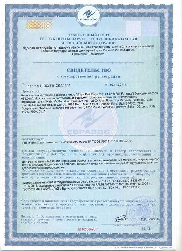 БАД к пище Шарк Рей Формула является дополнительным источником хондроитин сульфата и кальция.